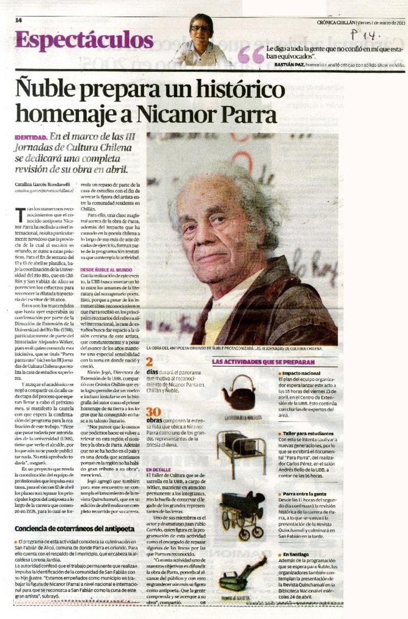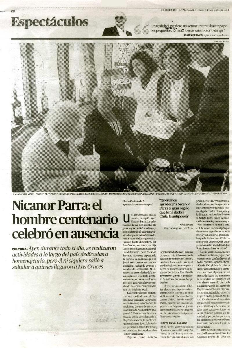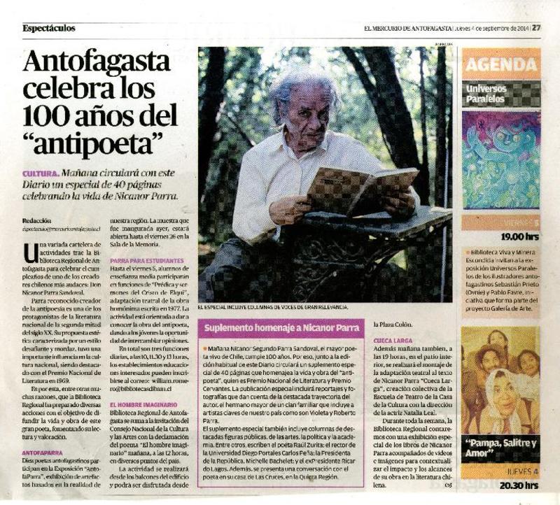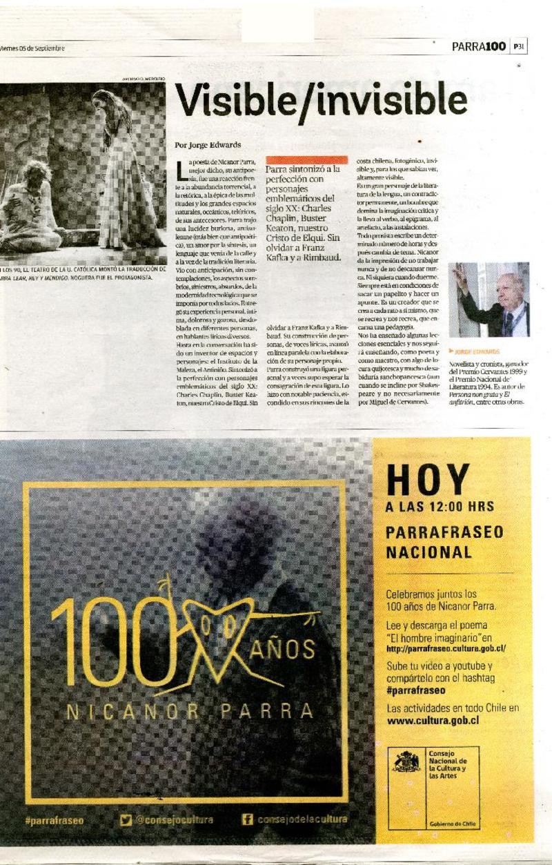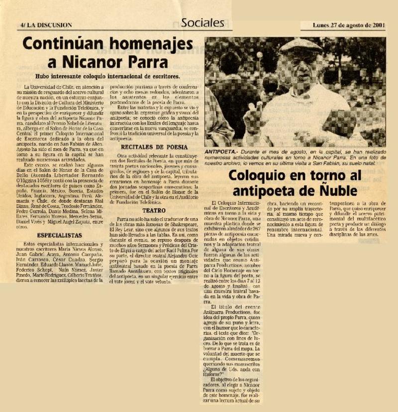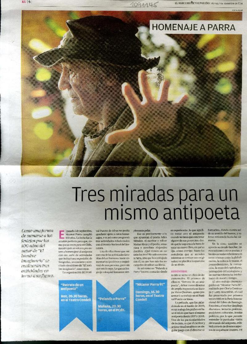 Antiparra productions, ciclo homenaje en torno a la figura y obra de Nicanor Parra [artículo]Manuel Alcides Jofré.