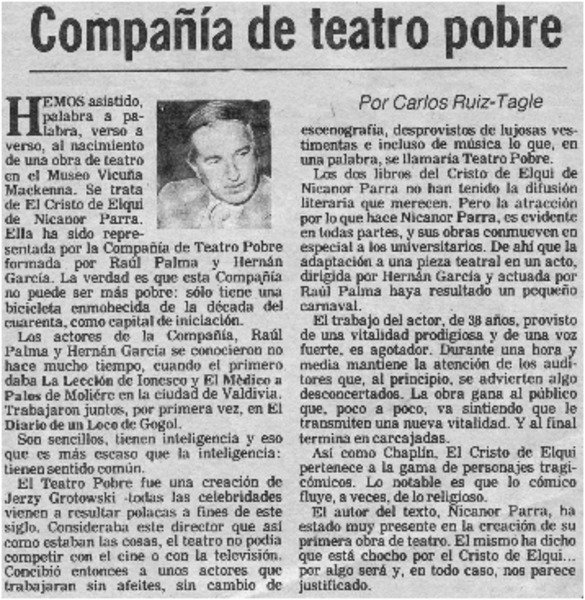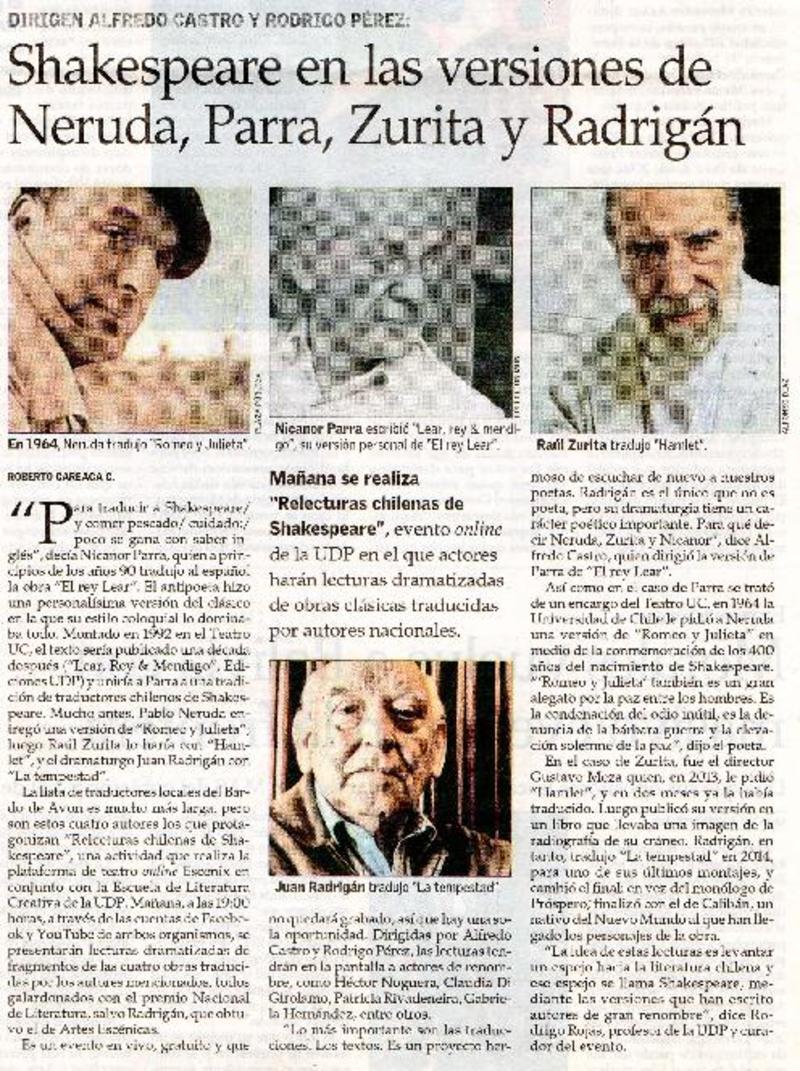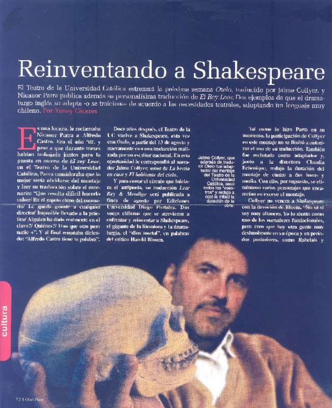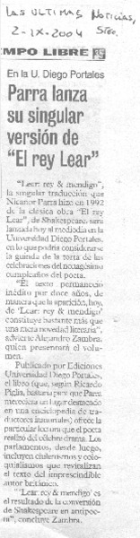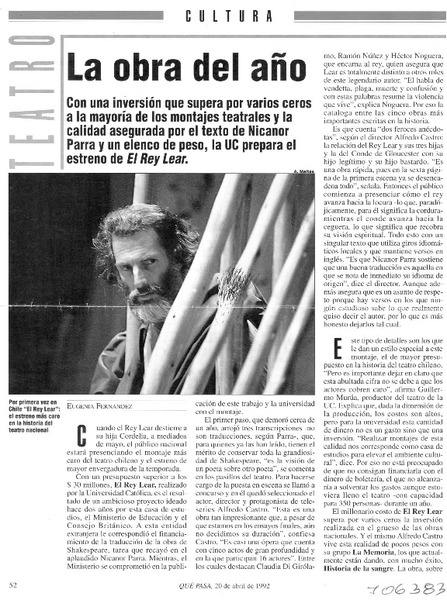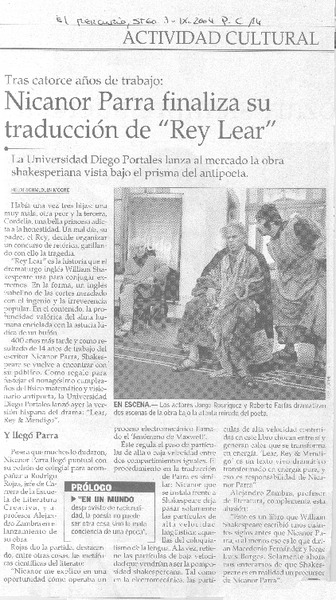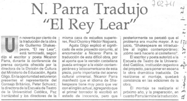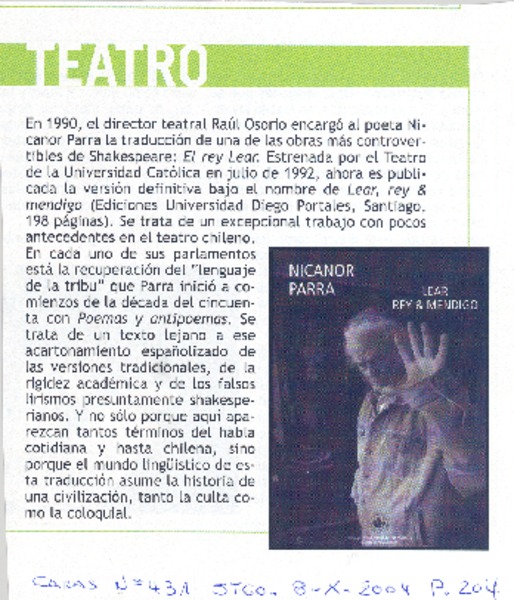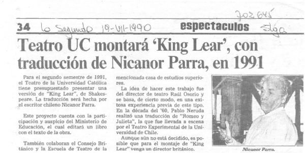 Teatro UC montará "King lear", con traducción de Nicanor Parra, en 1991. [artículo]
