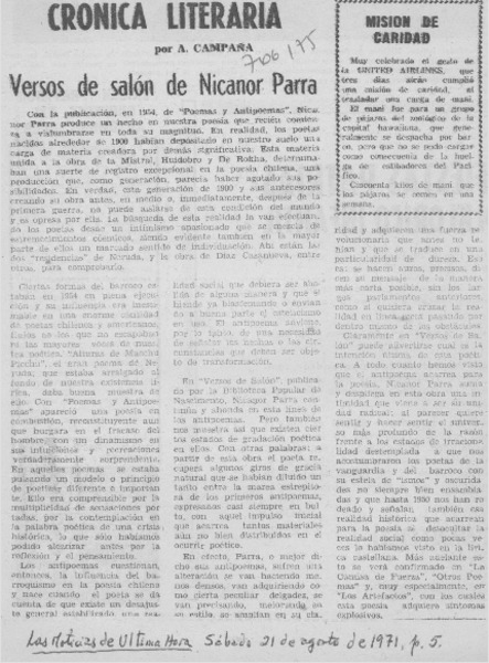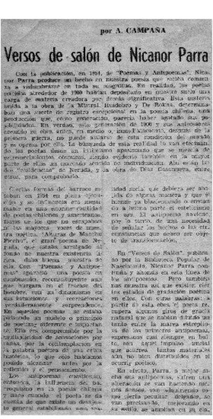Versos de salón de Nicanor Parra [artículo] A. Campaña.