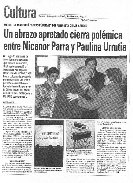 Un abrazo apretado cierra polémica entre Nicanor Parra y Paulina Urrutia [artículo] Javier García.