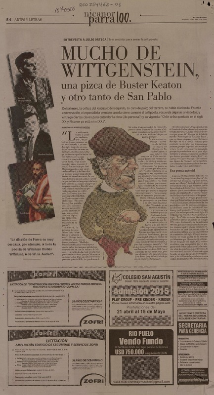 Tres modelos para armar la antipoesía: Mucho de Witgenstein, una pizca de Buster Keaton y otro tanto de San Pablo [artículo] Juan Ignacio Rodríguez Medina