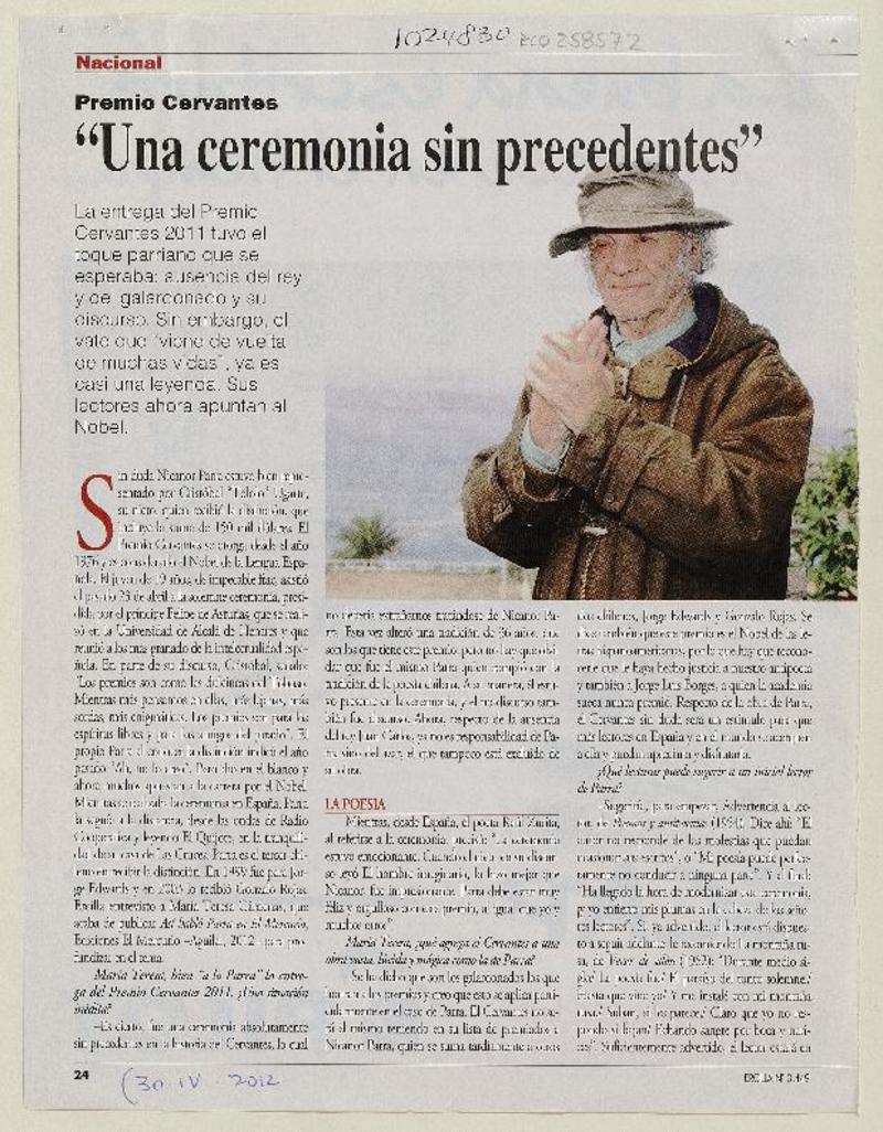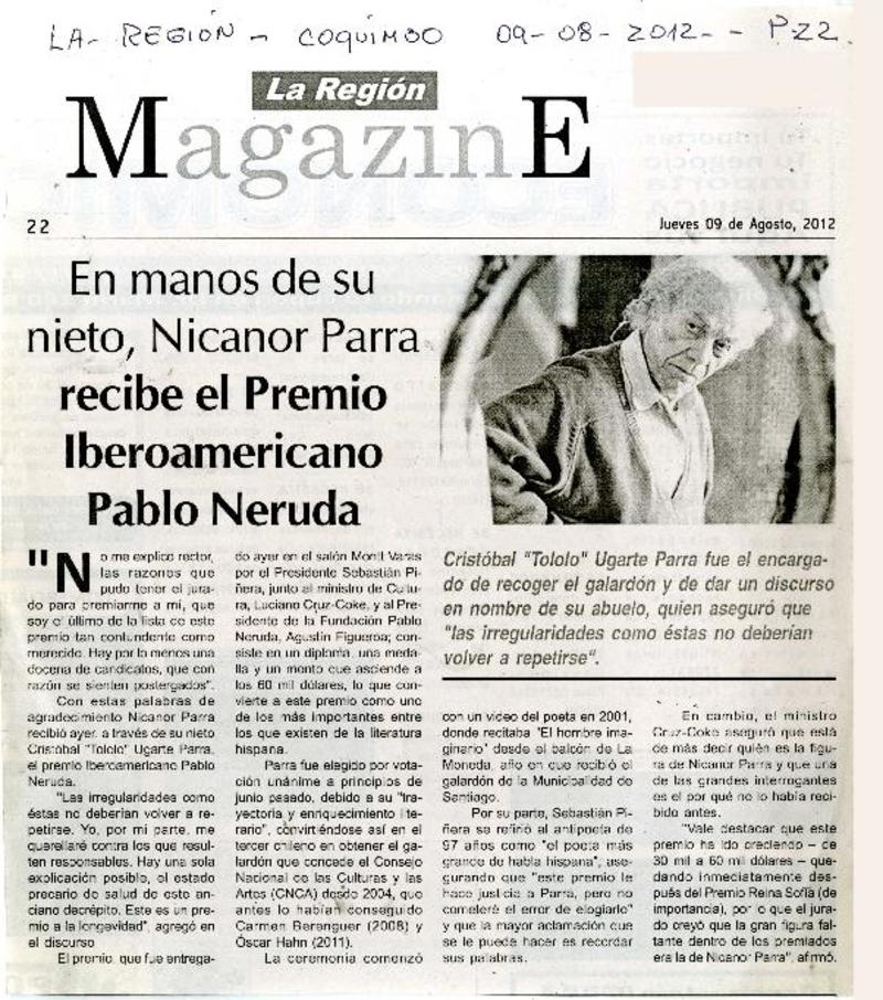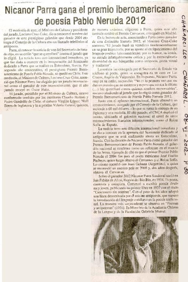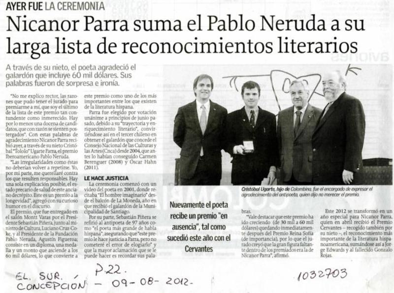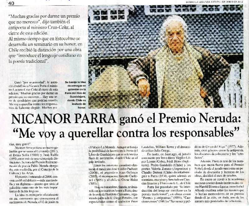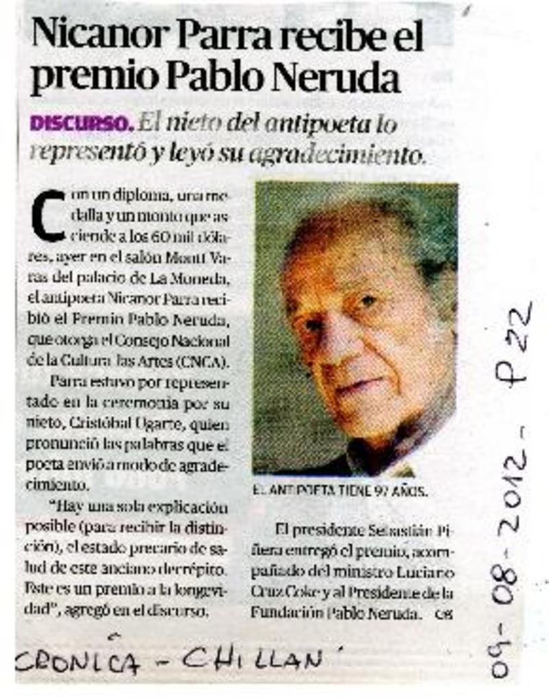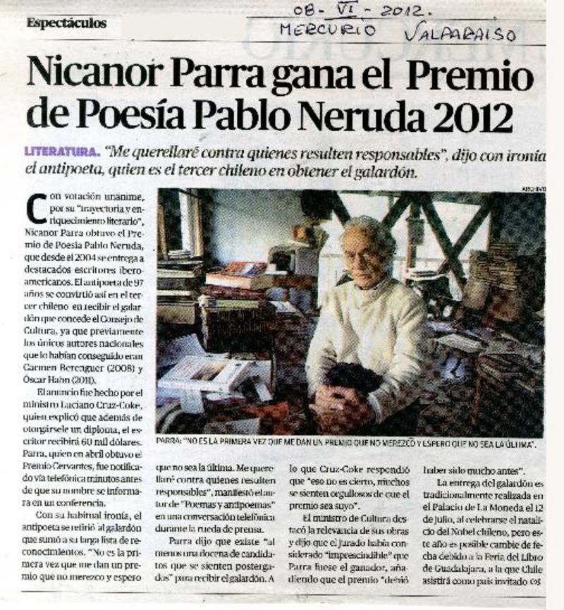 Antipoeta Nicanor Parra recibió premio Pablo Neruda [artículo]