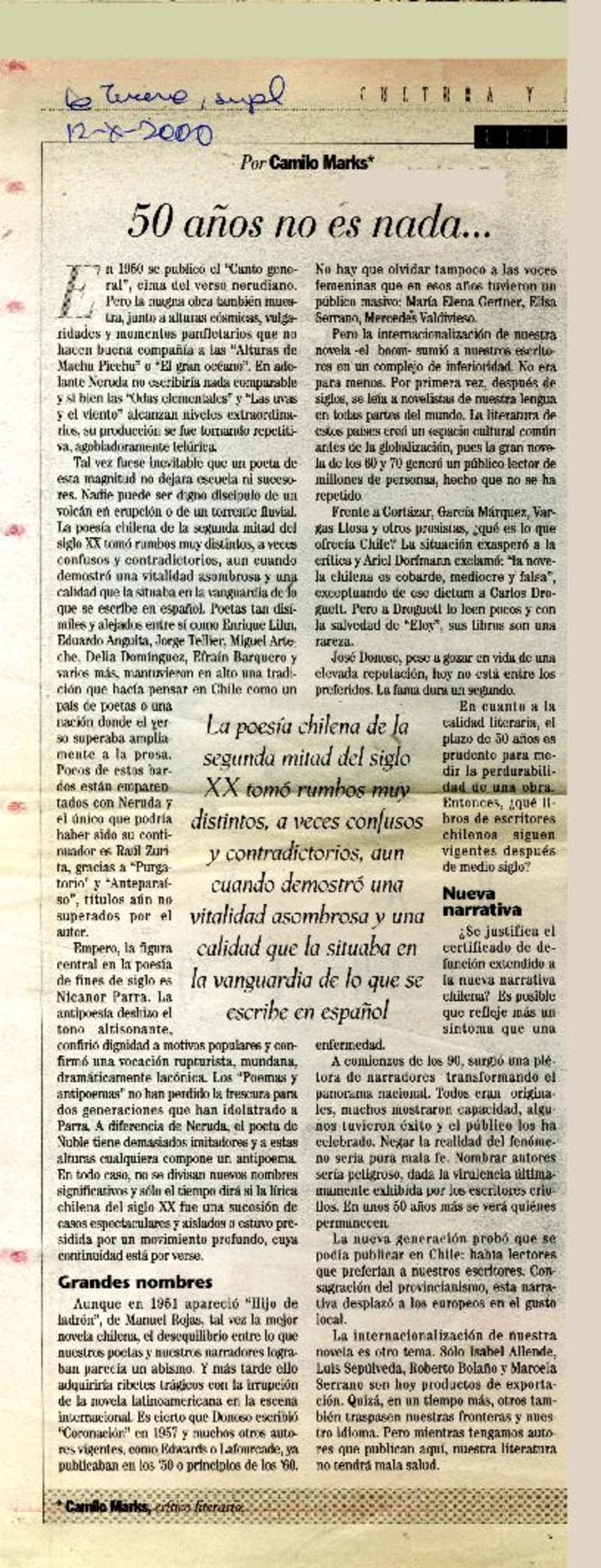 40 años de la literatura chilena [artículo] Luis Merino Reyes.