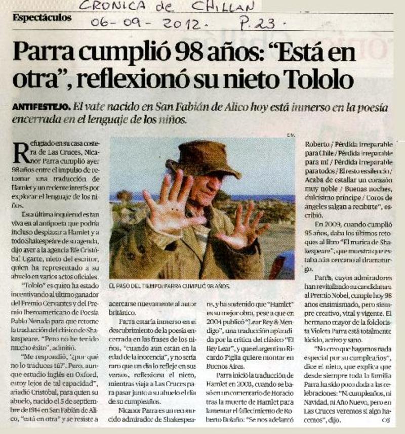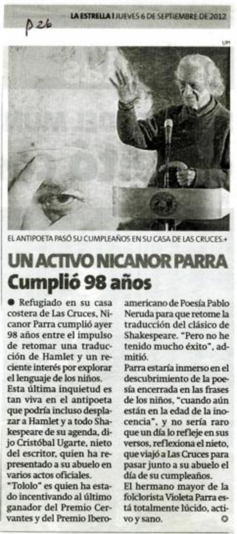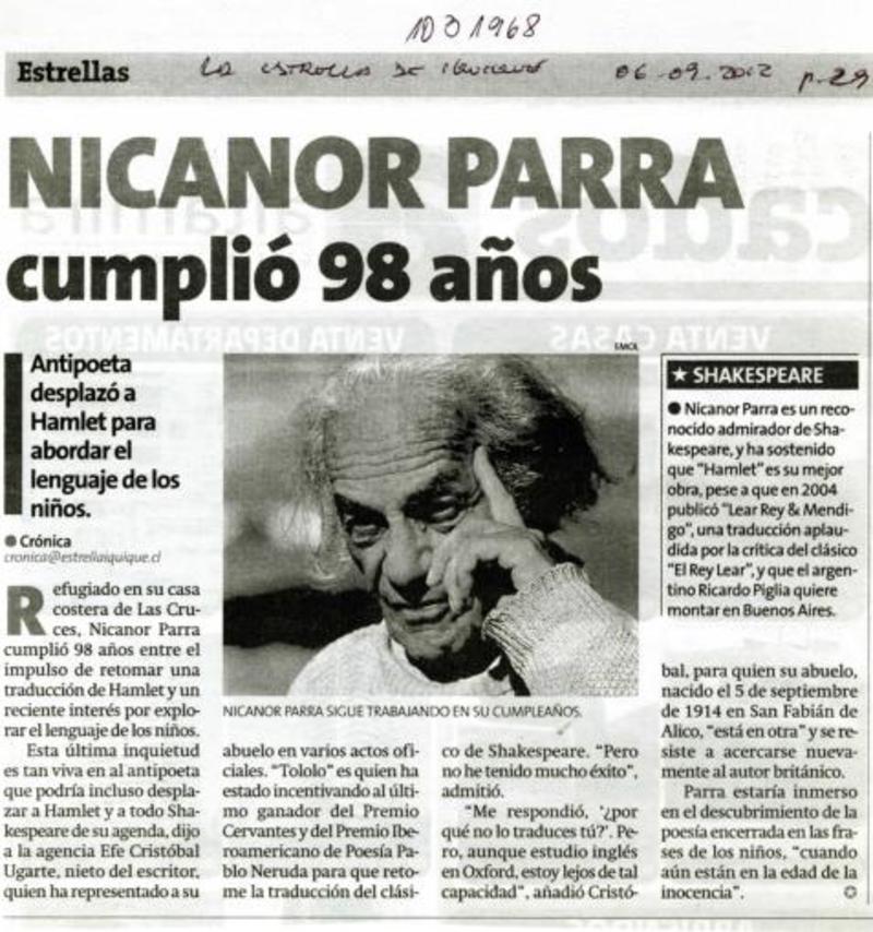 Un activo Nicanor Parra cumplió 98 años [artículo]