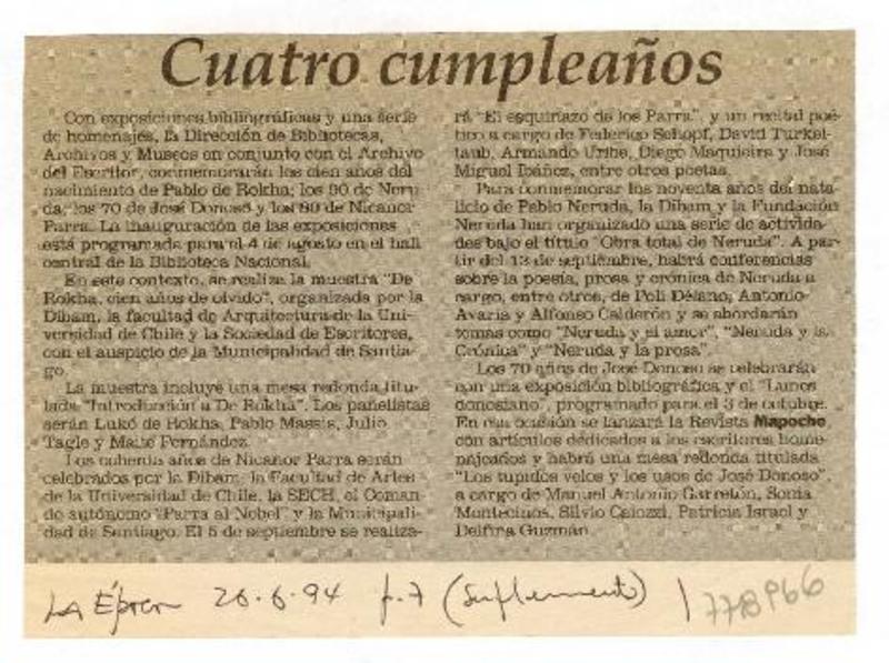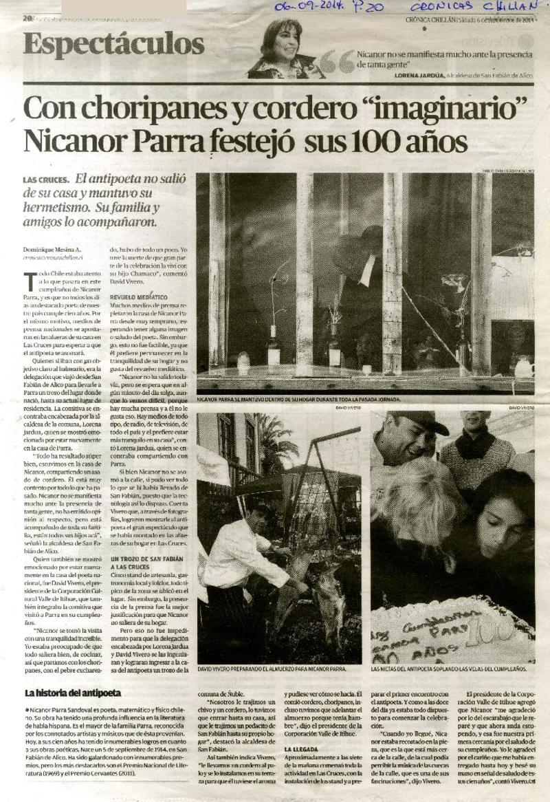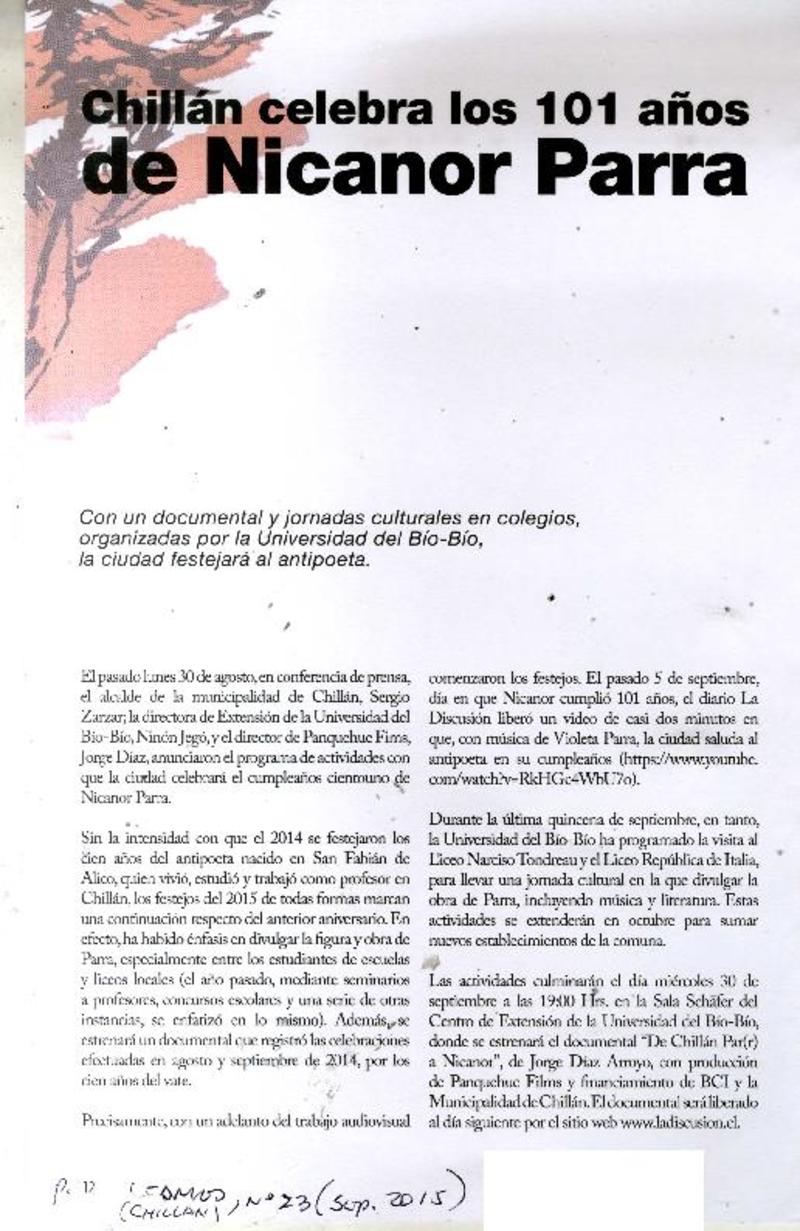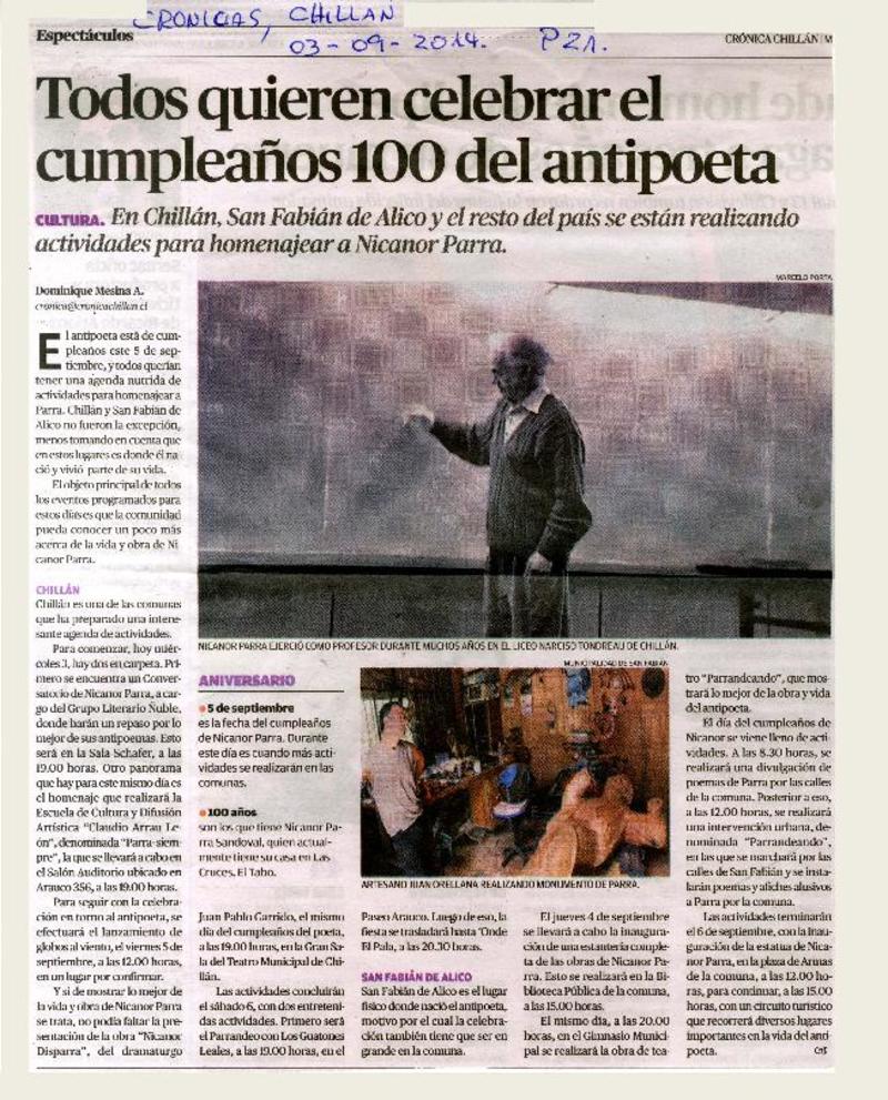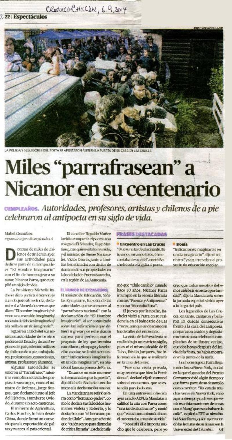 Todos quieren celebrar el cumpleaños 100 del antipoeta [artículo] Dominique Mesina A.