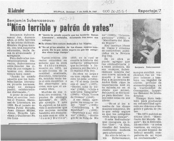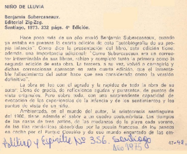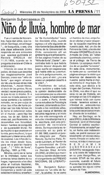 Autores chilenos - Entrevistas - Subercaseaux, Benjamín - Niño de lluvia