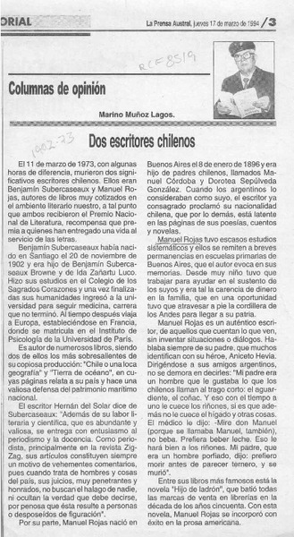 Dos escritores chilenos [artículo] Marino Muñoz Lagos.