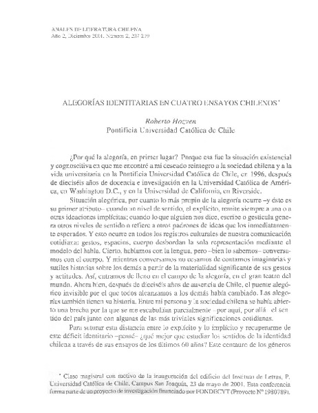 Alegorías identitarias en cuatro ensayos chilenos [artículo] Roberto Hozven.