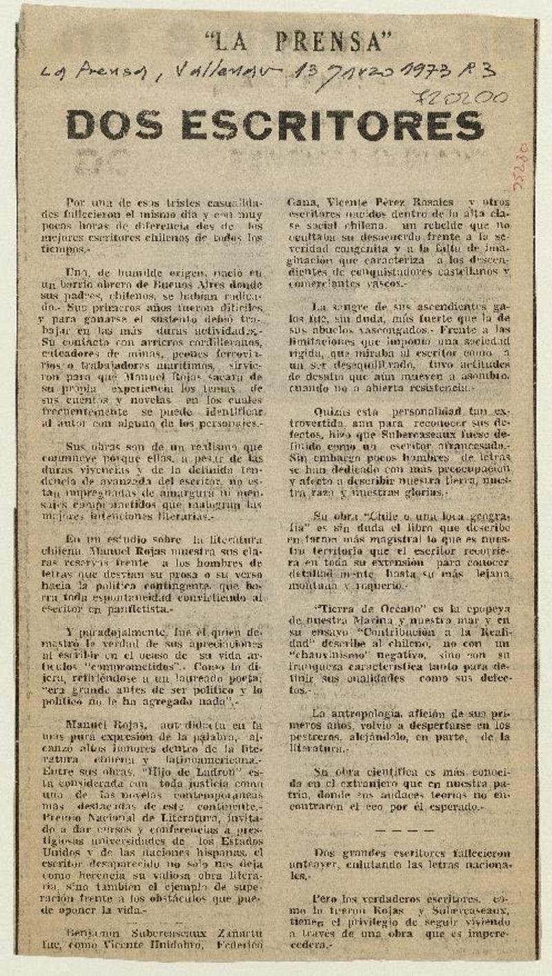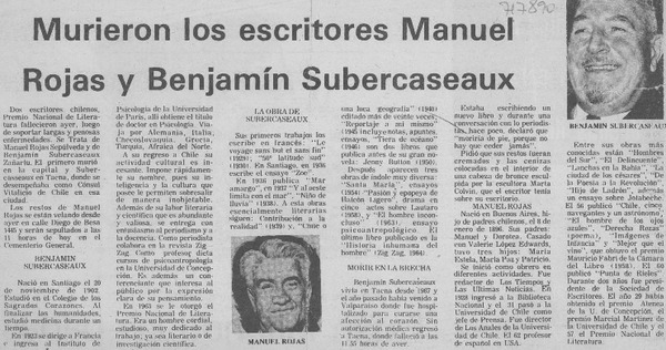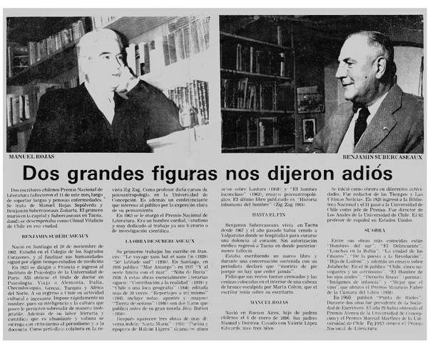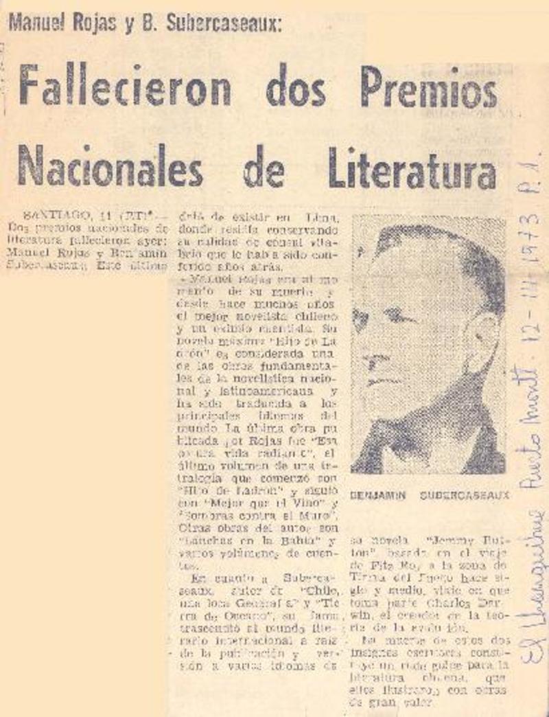 Fallecieron Manuel Rojas y Benjamín Subercaseaux. [artículo]