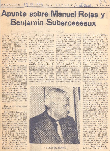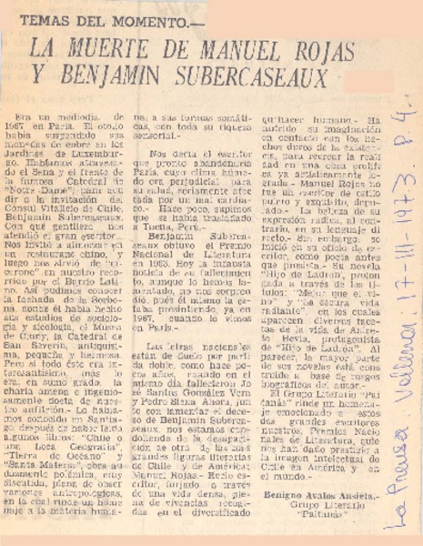 La muerte de Manuel Rojas y Benjamín Subercaseaux [artículo] Benigno Avalos Ansieta.