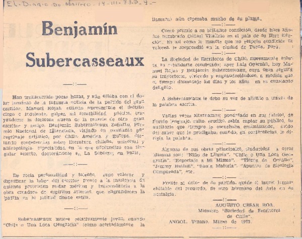 Benjamín Subercaseaux [artículo] Augusto César Roa.