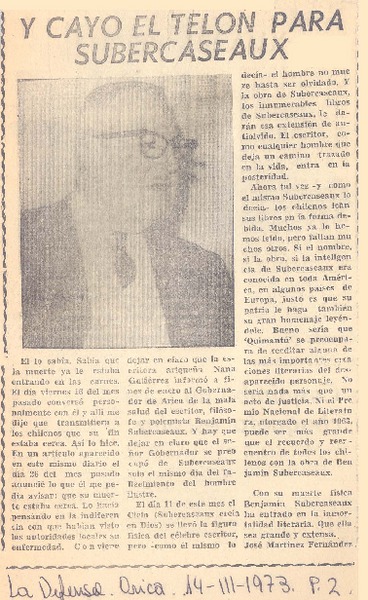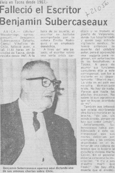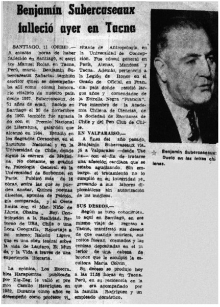 Benjamín Subercaseaux falleció ayer en Tacna. [artículo]