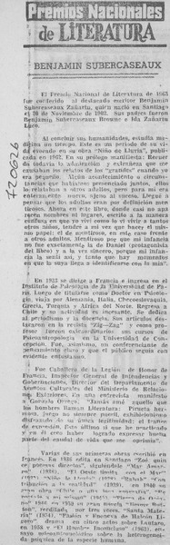 Benjamín Subercaseaux, Premio Nacional de Literatura [artículo] Fernando Santiván.