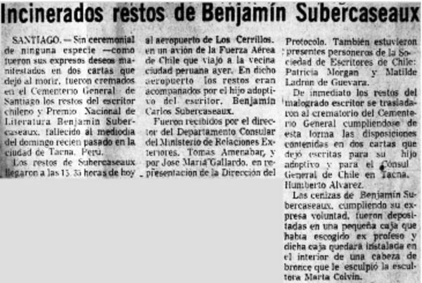 Incinerados restos de Benjamín Subercaseaux. [artículo]