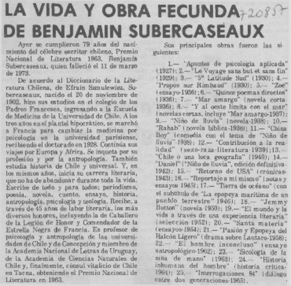 La vida y obra fecunda de Benjamín Subercaseaux. [artículo]