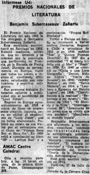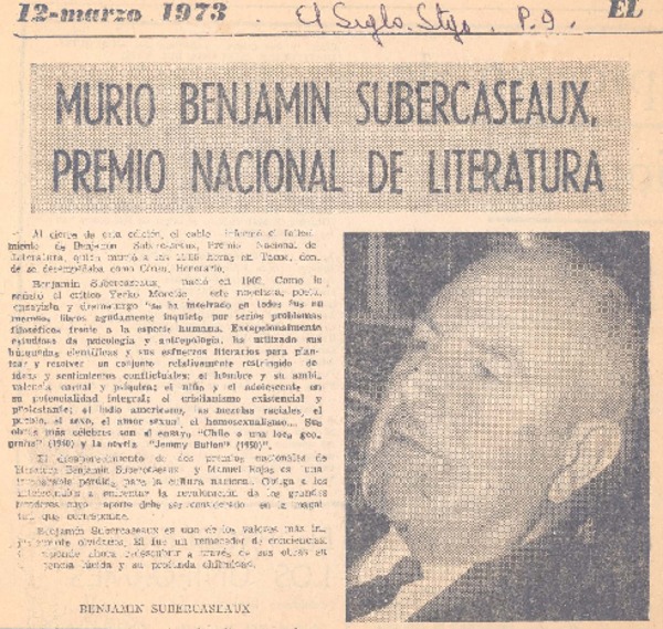 Murió Benjamín Subercaseaux Premio Nacional de Literatura. [artículo]