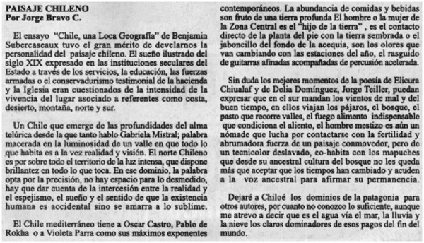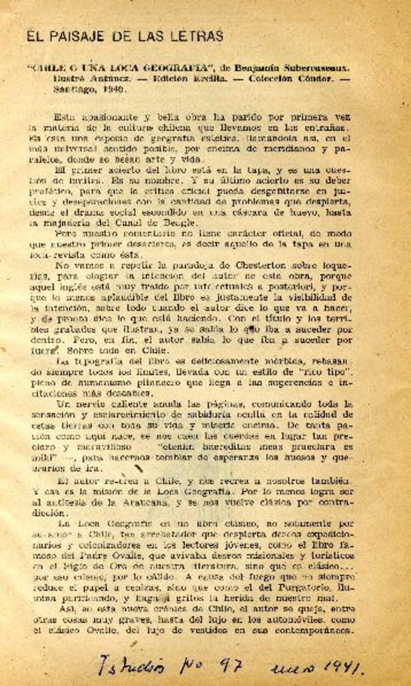 "Chile o una loca geografía", ensayo de Benjamín Subercaseaux. [artículo].