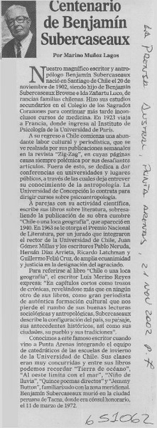 Centenario de Benjamín Subercaseaux [artículo] Marino Muñoz Lagos