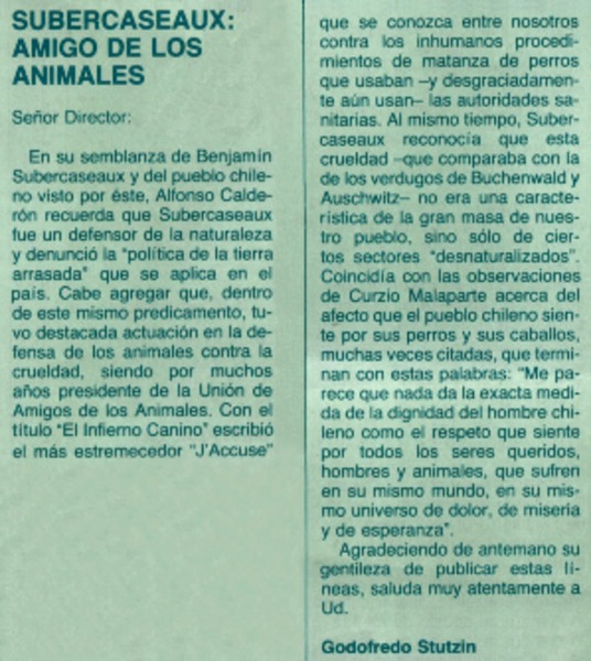 Subercaseaux: amigo de los animales [artículo] Godofredo Stutzin.