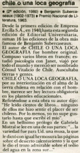 Subercaseaux, Benjamín - Autores chilenos - Chile, o, una loca geografía