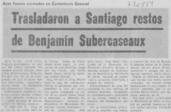 Trasladaron a Santiago restos de Benjamín Subercaseaux. [artículo]