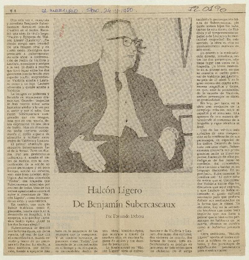 Halcón ligero de Benjamín Subercaseaux [artículo] Fernando Debesa.