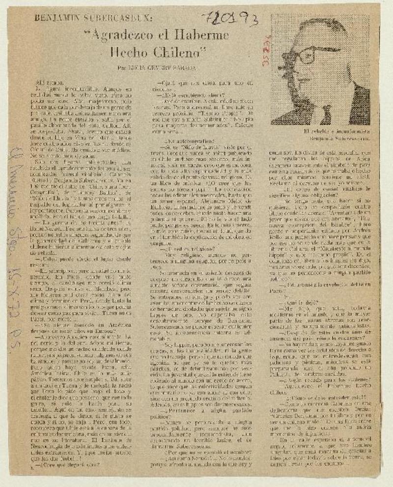 Candentes declaraciones de Benjamín Subercaseaux. [artículo]