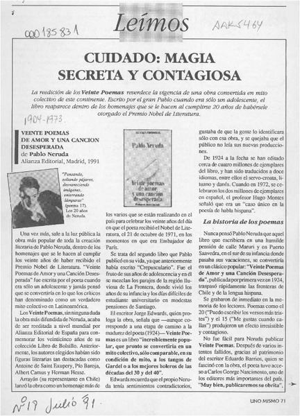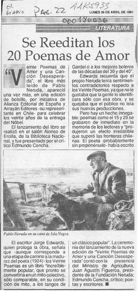 Veinte poemas de amor y una canción desesperada [artículo] Claudio Solar.
