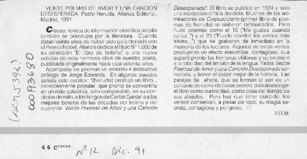 Veinte poemas de amor y una canción desesperada [artículo] R. R. M.