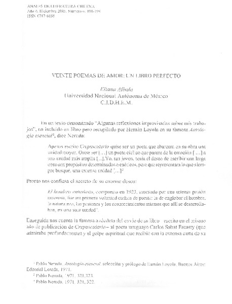 Veinte poemas de alo: un libro perfecto [artículo] Eliana Albala.