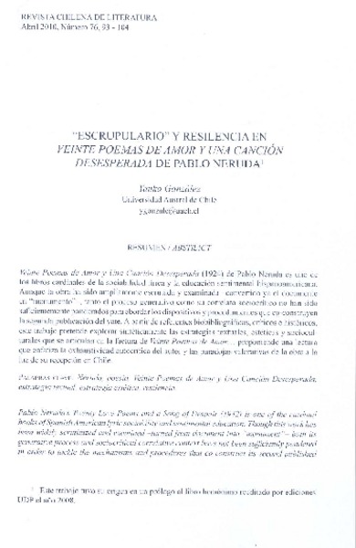 "Escrupulario" y resilencia en Veinte poemas de amor y una canción desesperada de Pablo Neruda [artículo] Yanko González.