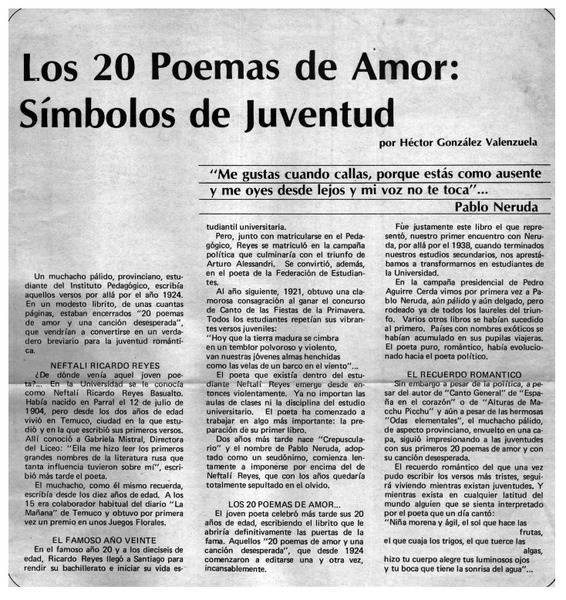 Los 20 poemas de amor, símbolos de juventud [artículo] Héctor González Valenzuela.