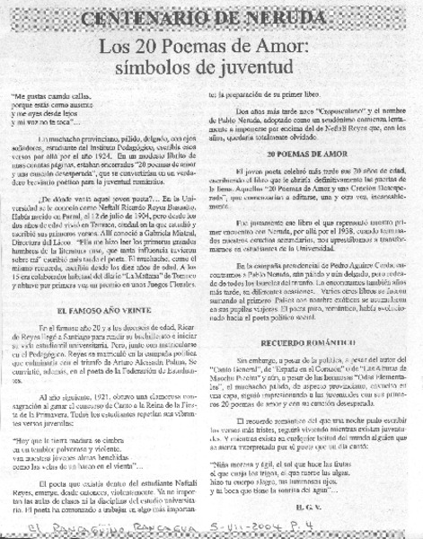 Los 20 poemas de amor, símbolos de la juventud [artículo] Héctor González V.