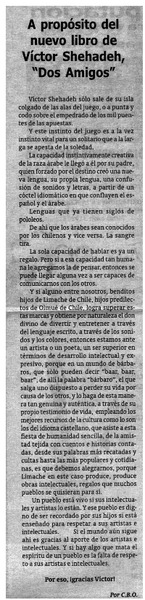 A propósito del nuevo libro de Víctor Shehadeh, "Dos amigos" [artículo] C. B. O.