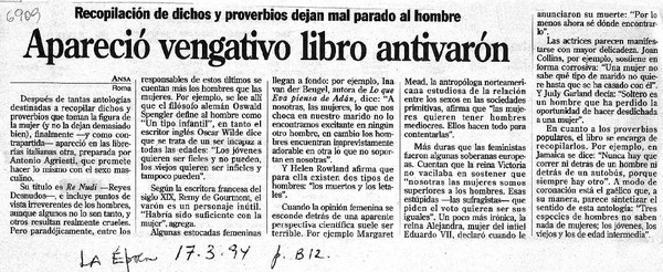Apareció vengativo libro antivarón. [artículo].