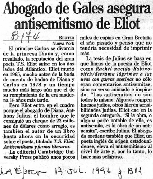 Abogado de Gales asegura antisemitismo de Eliot. [artículo]
