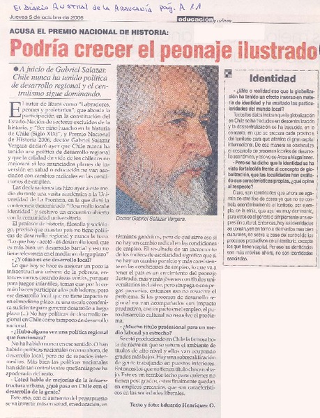 Acusa el Premio Nacional de Historia Podria crecer el peonaje ilustrado [artículo] : texto y foto de Eduardo Henríquez O.