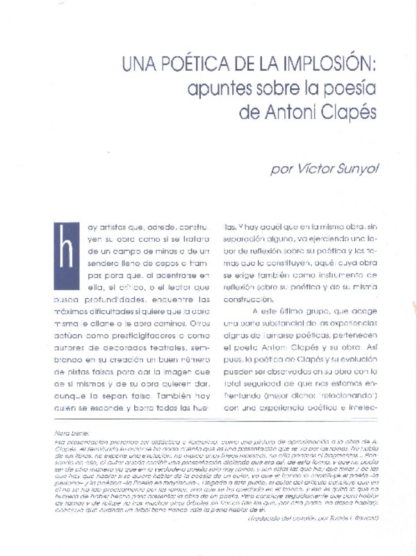 Una poética de la implosión : apuntes sobre la poesía de Antonio Clapés [artículo] Víctor Sunyol.