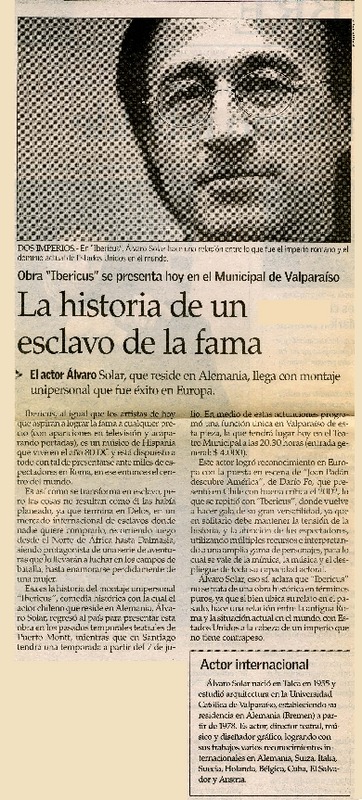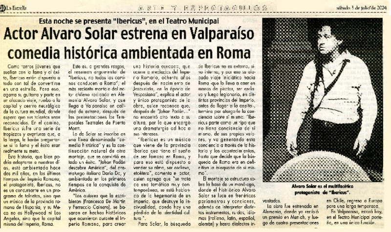 Actor Alvaro Solar estrena en Valparaíso comedia histórica ambientada en Roma. [artículo]