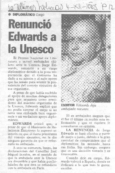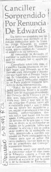 Canciller sorprendido por renuncia de Edwards [artículo].