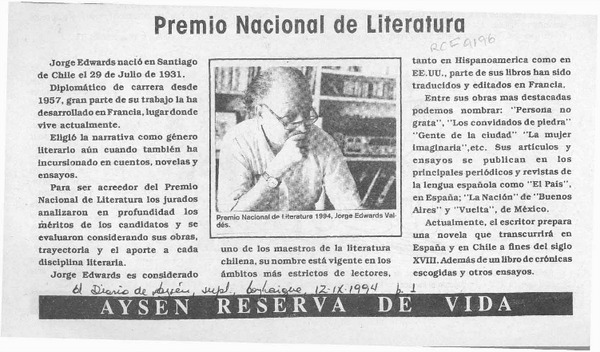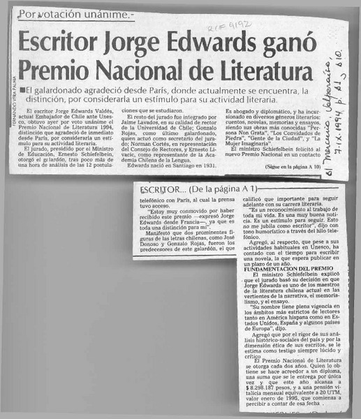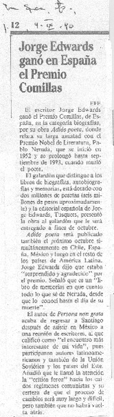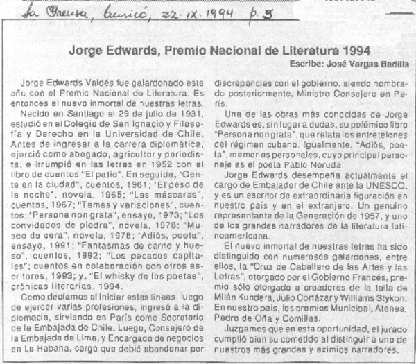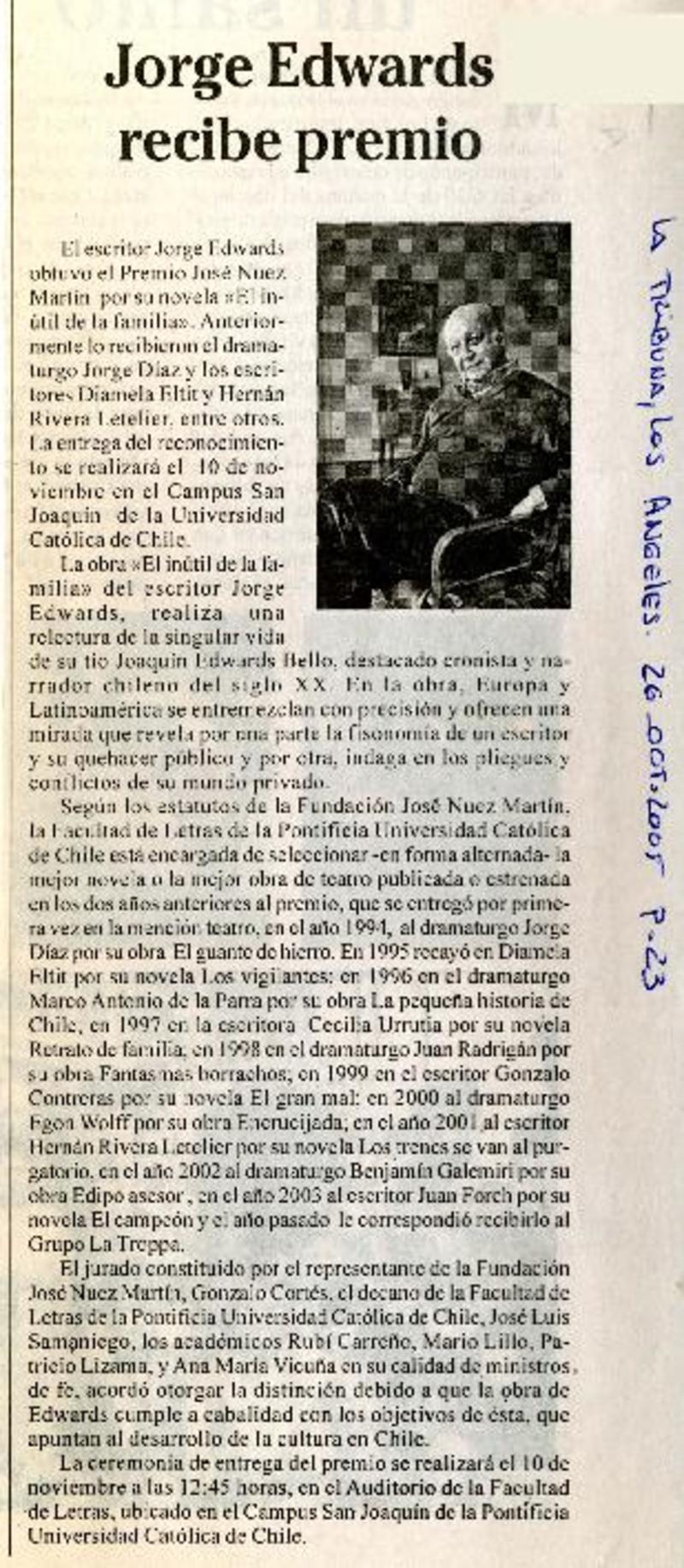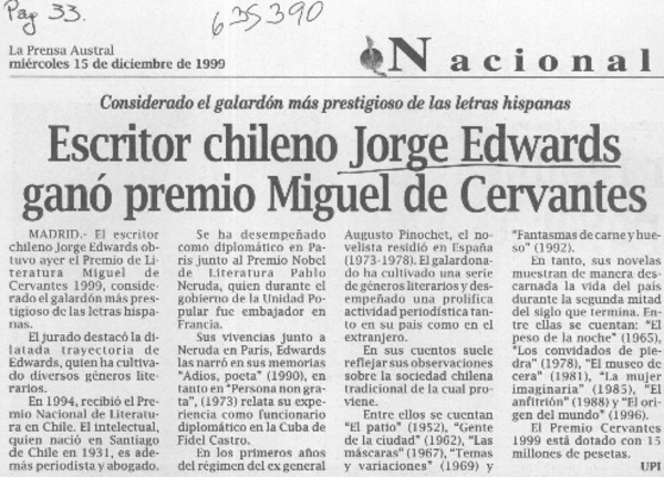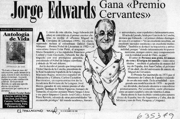 Chileno Jorge Edwards ganó el "Nobel" español de literatura [artículo].