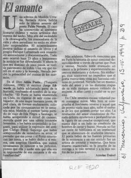 Amores de Pablo Neruda atrapados en veinte poemas inolvidables [artículo] Samuel Valenzuela Y.