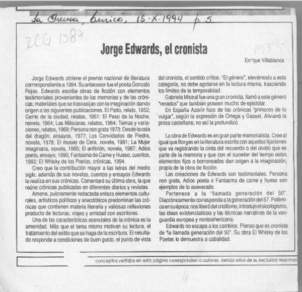 Acercamiento a Jorge Edwards [artículo] Carlos León Pezoa.