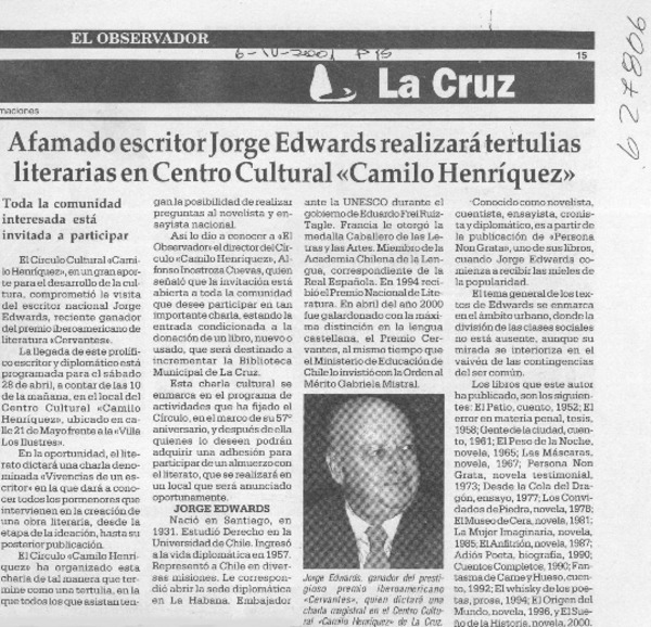Afamado escritor Jorge Edwards realizará tertulias literarias en Centro Cultural "Camilo Henríquez" [artículo]