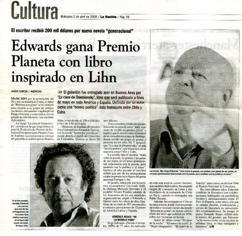 Autores chilenos - Lafourcade, Enrique - Lihn, Enrique - Edwards, Jorge - Premios literarios