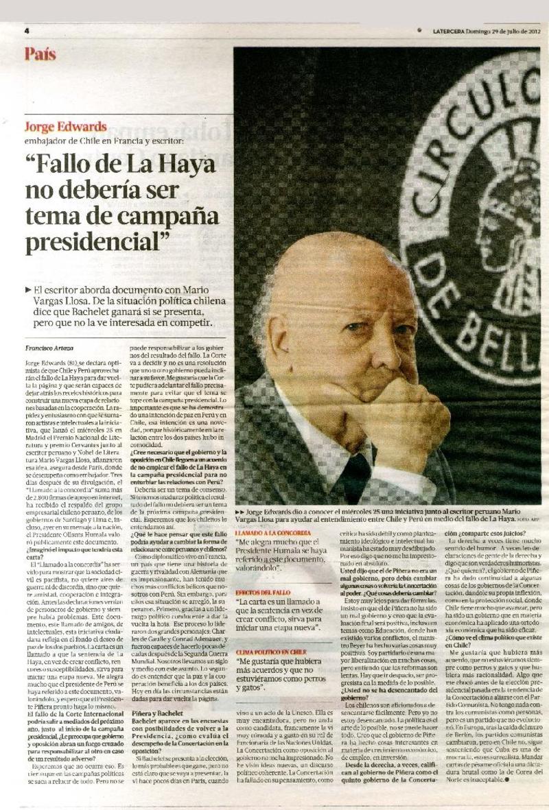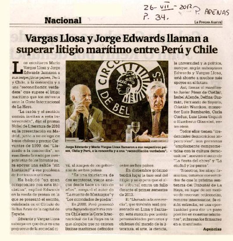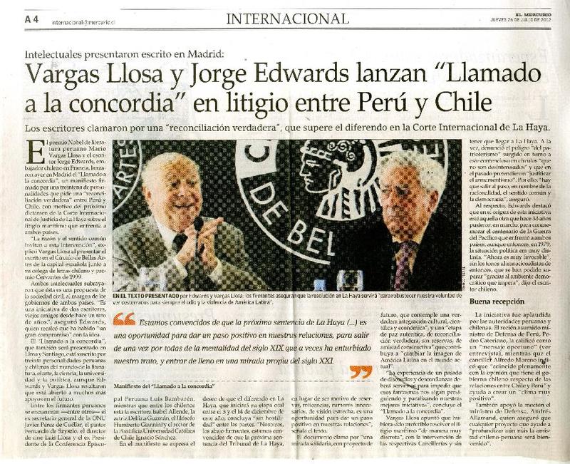 Vargas Llosa y Jorge Edwards lanzan "llamado a la concordia" en litigio entre Perú y Chile. [artículo].