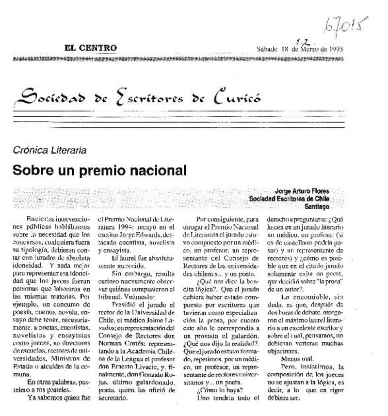 Sobre un Premio Nacional [artículo] Jorge Arturo Flores.