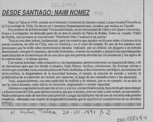 Autores chilenos - Nómez, Naín - Escrito en Rokha