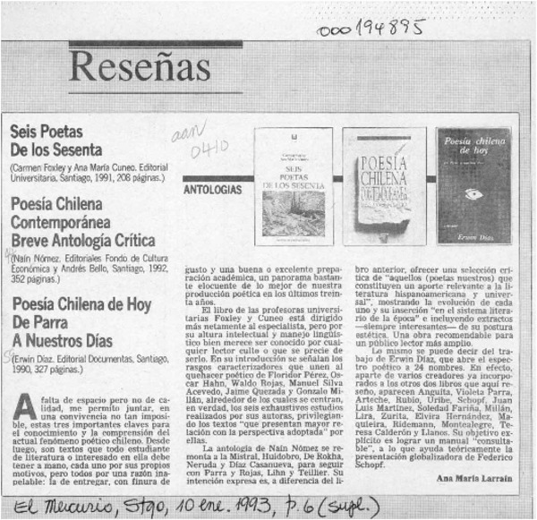 FOXLEY, CARMEN - CUNEO, ANA MARIA - SEIS POETAS DE LOS SESENTA - Poesía chilena contemporánea - DIAZ, ERWIN - Nómez, Naín - POESIA CHILENA DE HOY