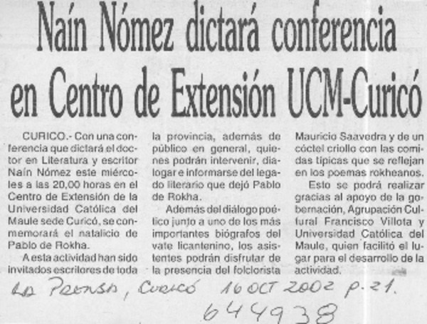 Naín Nómez dictará conferencia en Centro de Extensión UCM-Curicó [artículo]